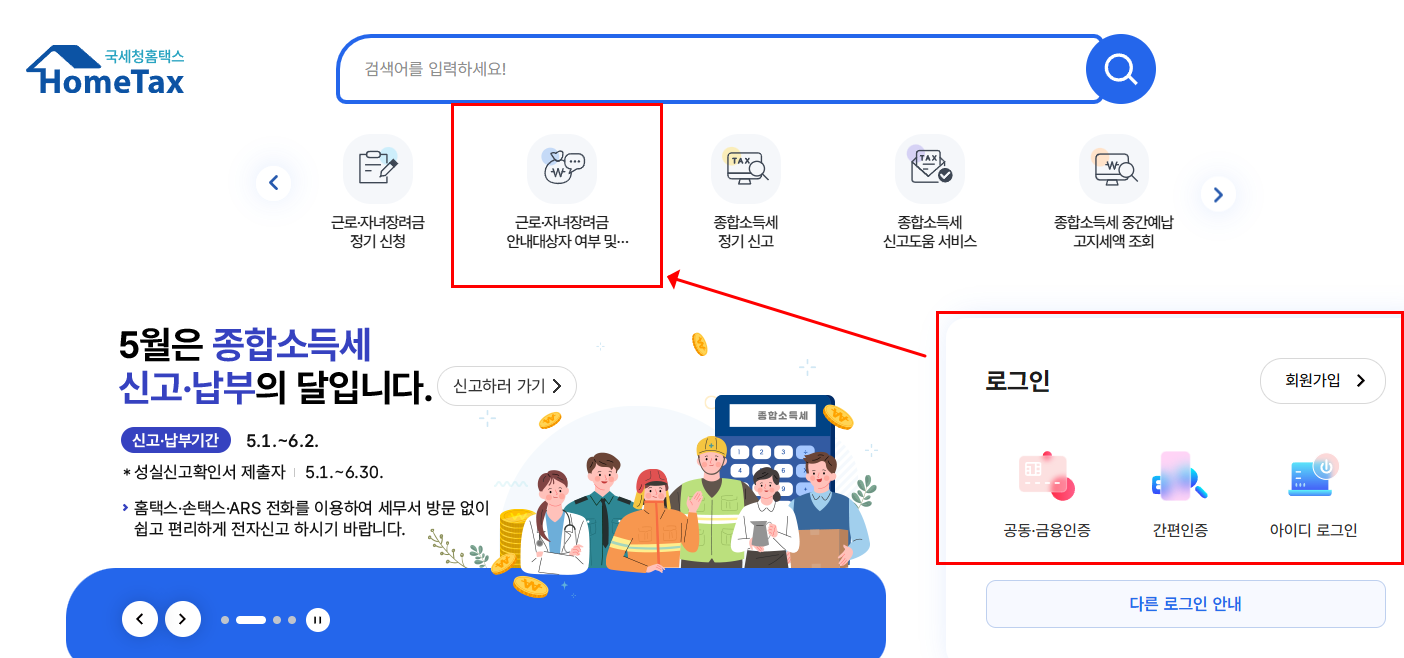 - 로그인 → 신청/제출 → 근로·자녀장려금 항목 선택 → 서류 제출